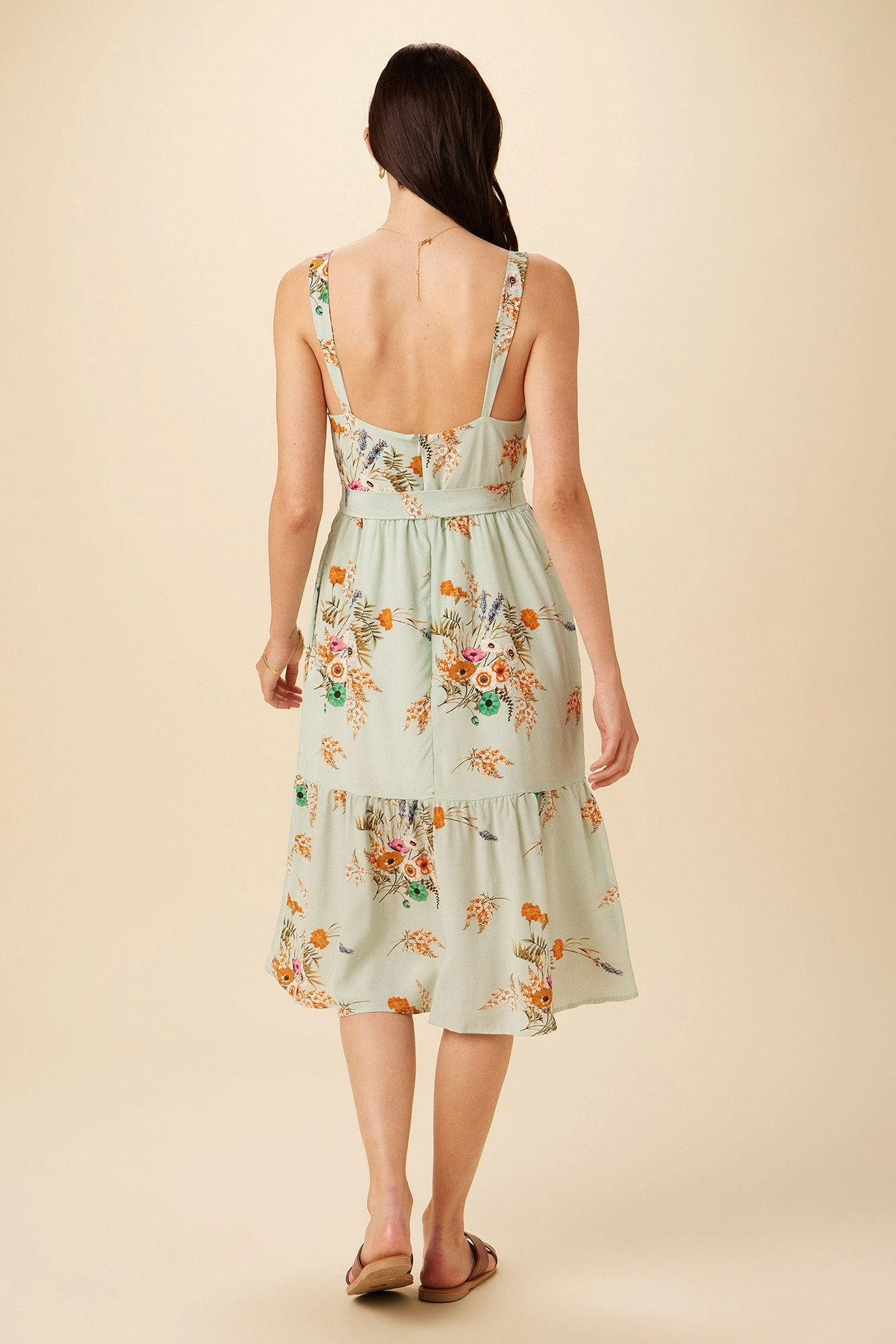 Slim fit midi dress that features an invisible zipper, detachable tie waist detail and pockets at the side seams, with a flounce at hem. Perfect for wine tastings, summer weddings, or midday picnic dates.