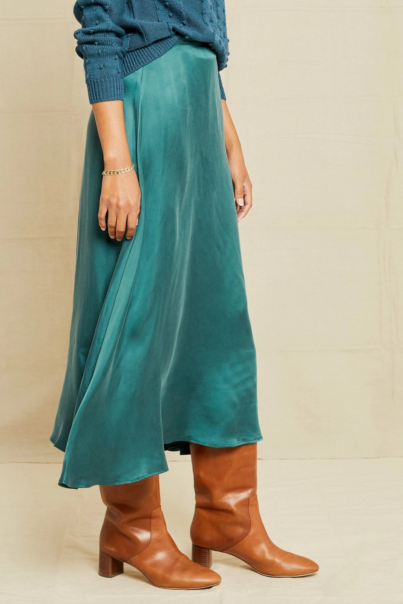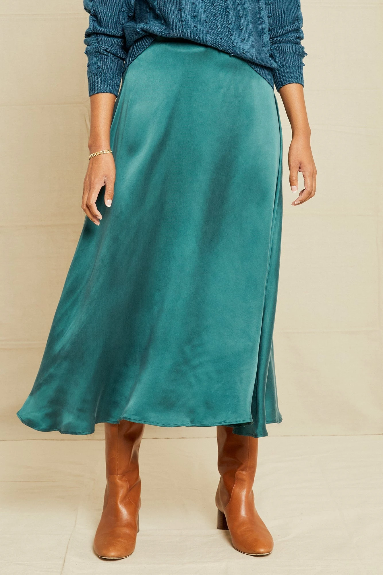 Voluminous midi skirt with a flat front and elastic waist in back, made in our softest plant-based silk alternative, Cottonseed Cupro.