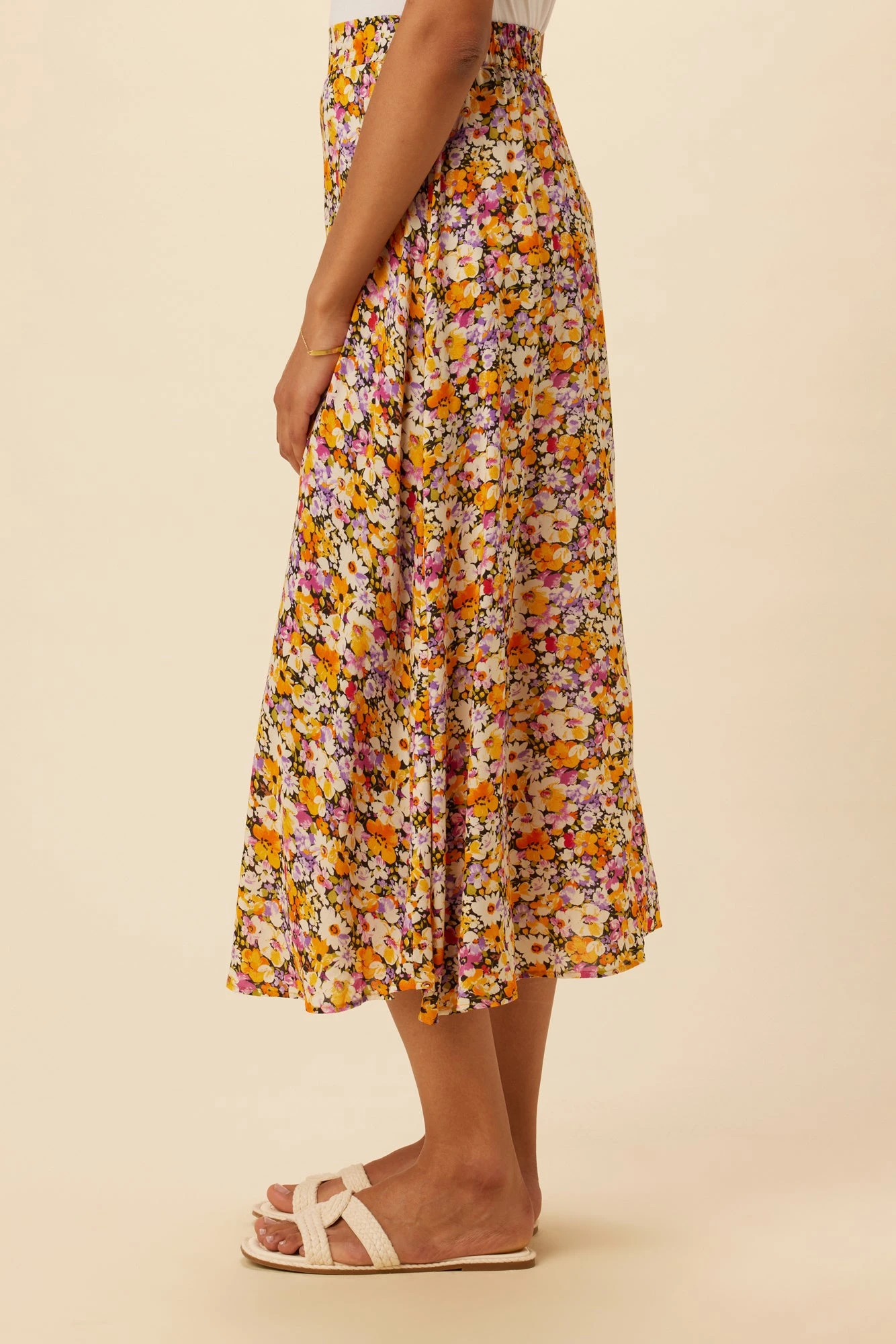 - Voluminous midi skirt with a flat front and elastic waist in back.