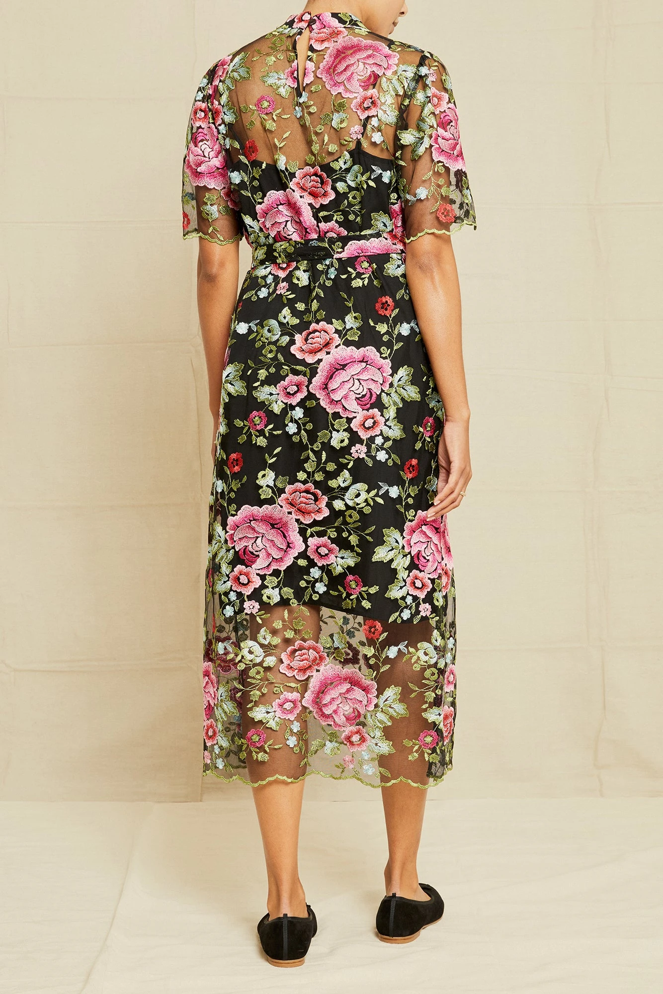 Mock neck, a-line embroidered midi dress with scallop sleeve and hem, detachable belt and a slip lining. Made from a blend of upcycled fabrics to stay true to our commitment to repurpose and give new life to leftover materials.