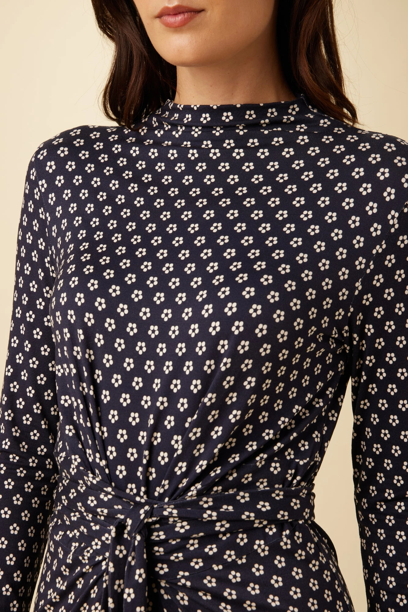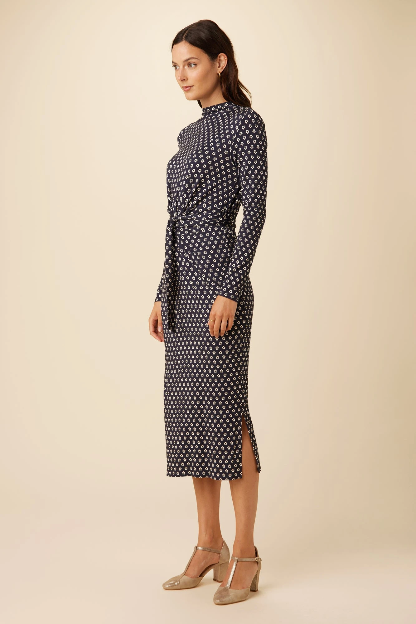 Midi dress featuring a mock neck, long sleeves, and an adjustable waist tie. Made from our Viscose Knit fabric for a soft and comfortable fit.