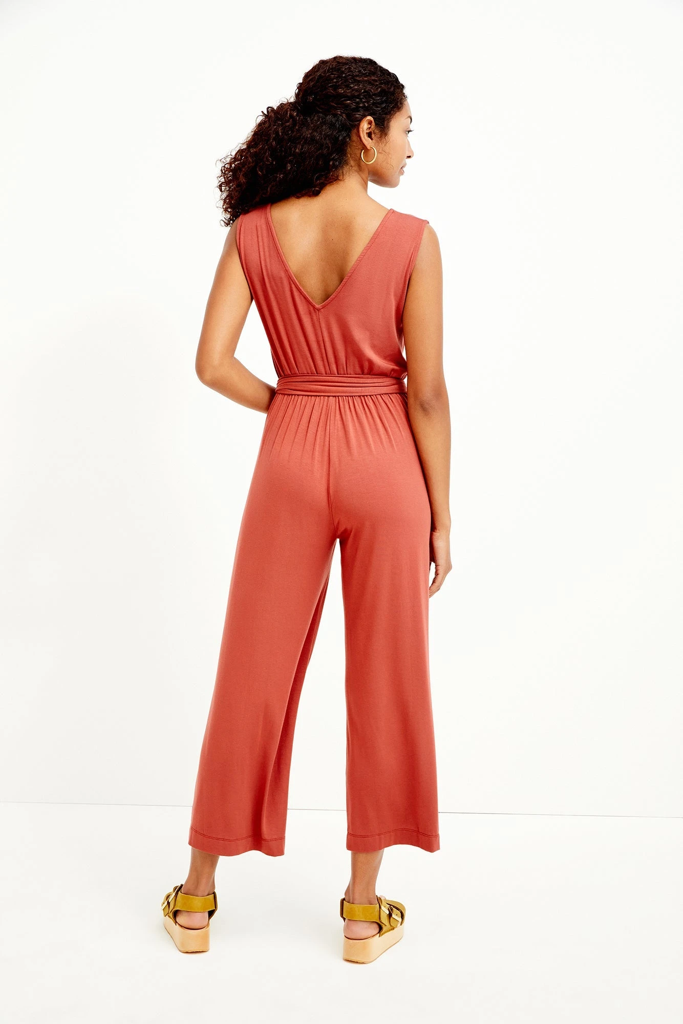 Sleeveless jumpsuit with an adjustable wrap tie at the waist, open back, and cropped leg. A true wardrobe staple, made from our softest signature beechwood blend.