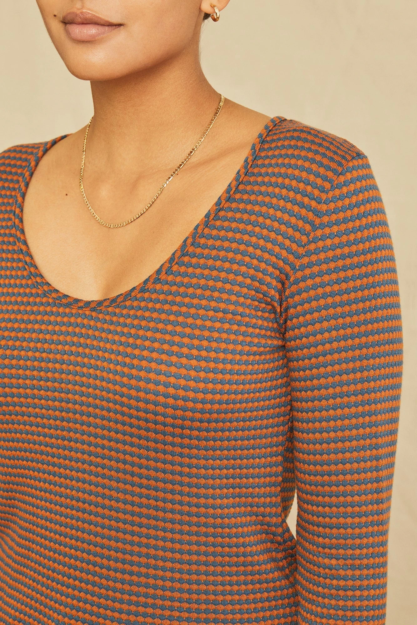 Long sleeve tee with an open neck and shirt-tail hem. A great layering piece, now updated in our super soft scallop knit blend.