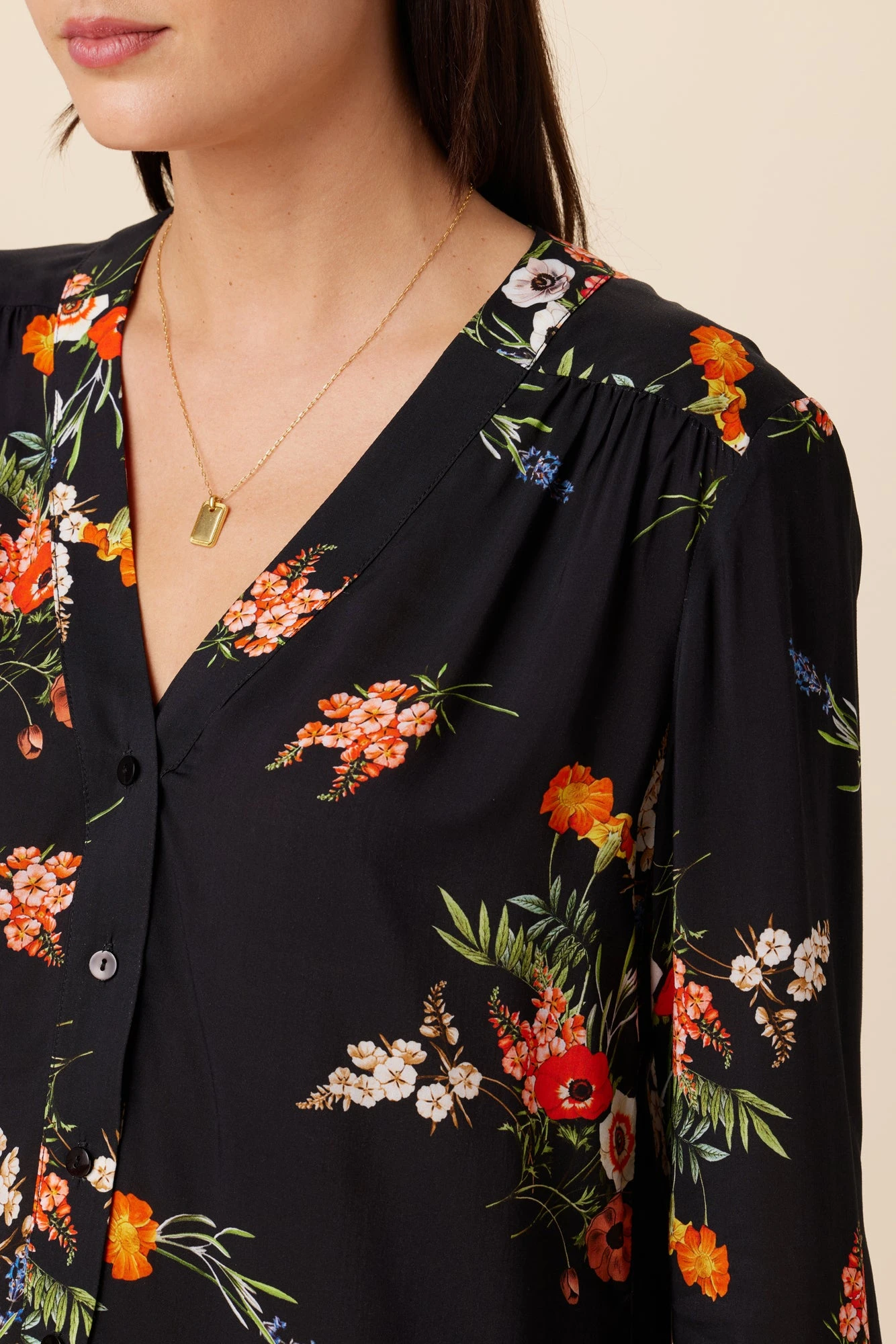 One of our best selling styles, this long sleeve, slim fit v-neck blouse features front placket buttons and cuffed sleeves and is made from Ecovero Viscose.