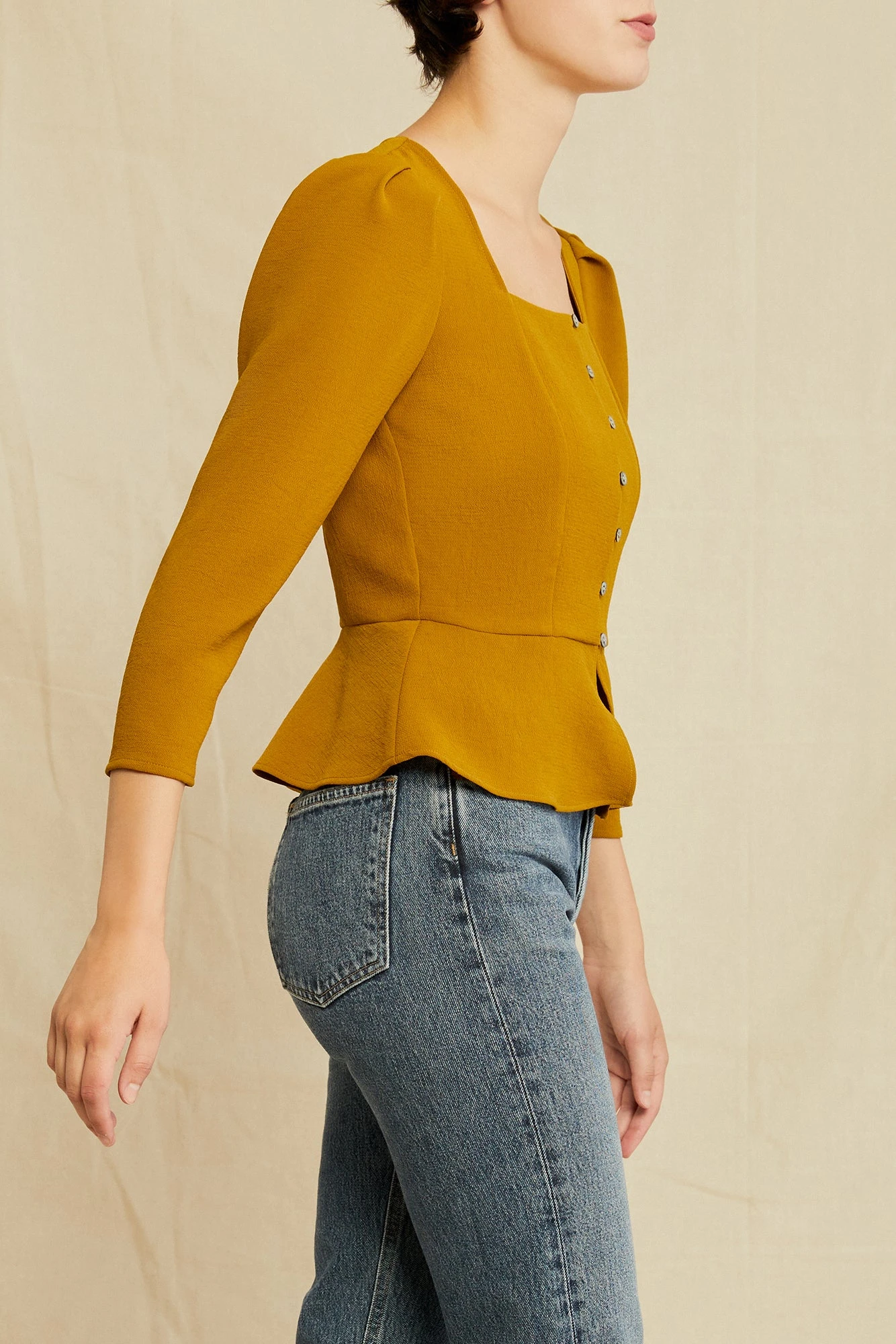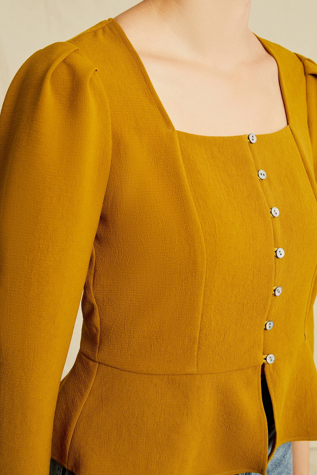 - Fitted style with square neck buttons and loops at center front and peplum at hem