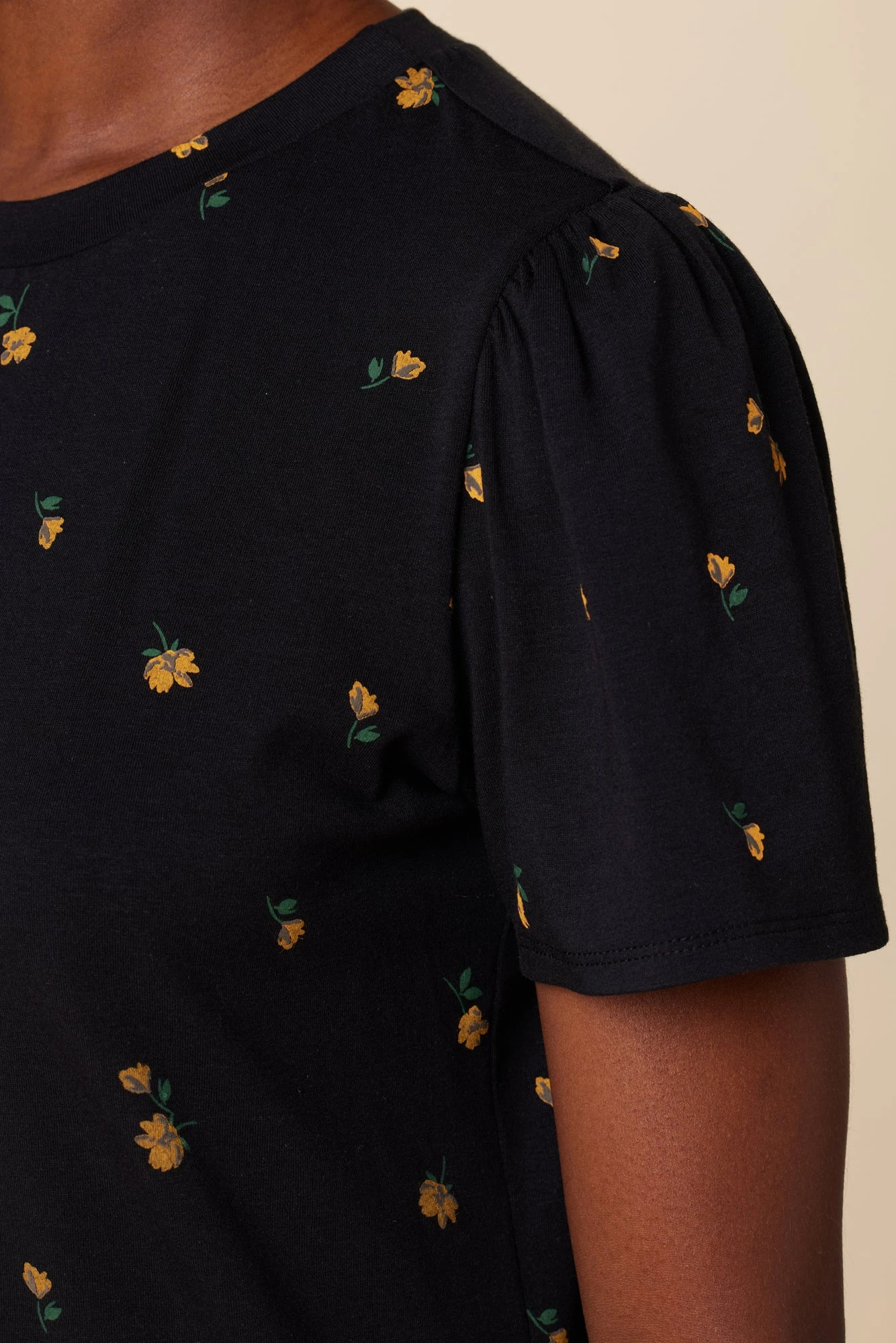 - Basic crewneck tee detailed with pleating at the sleeves for a little added volume.