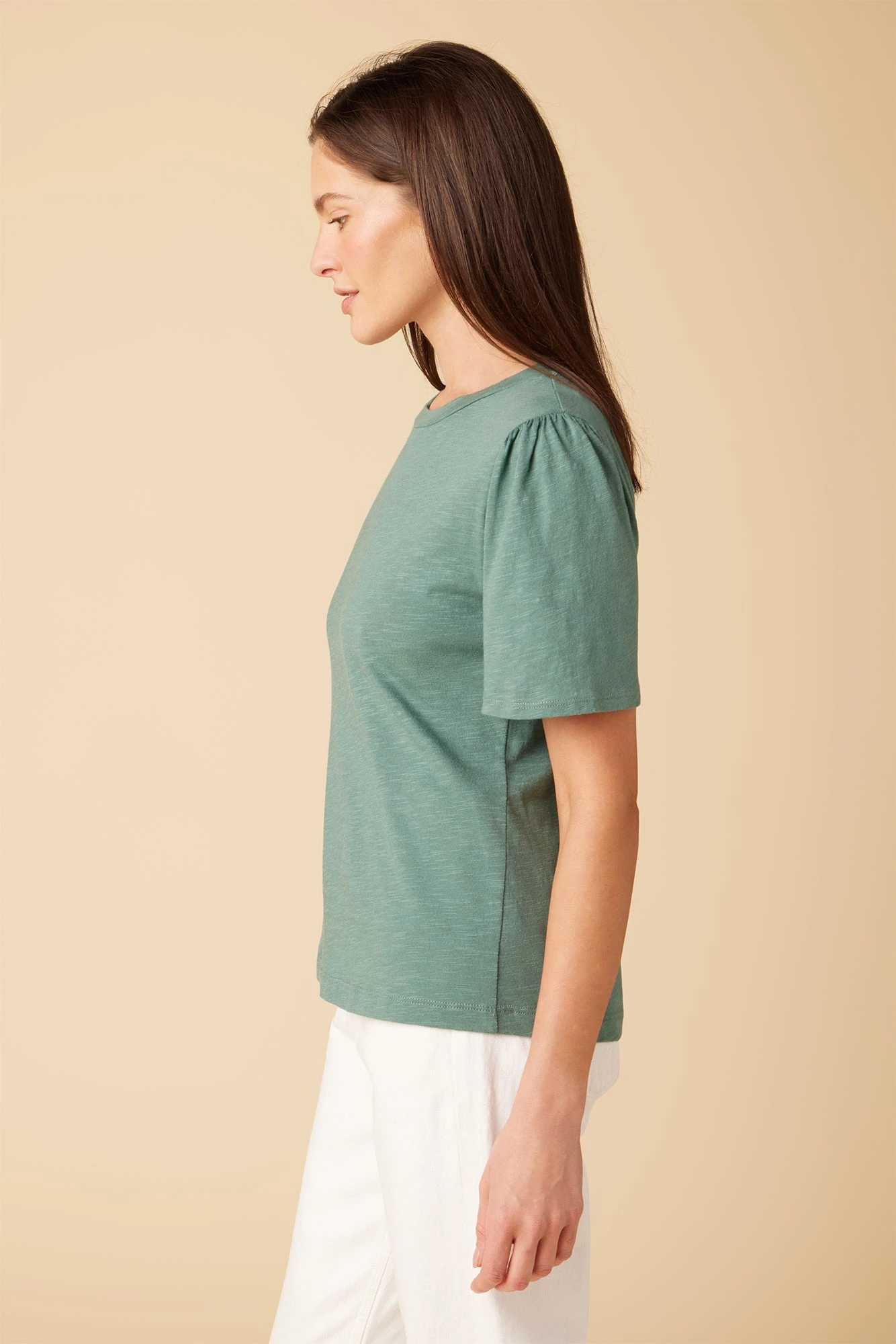 - Basic crewneck tee detailed with pleating at the sleeves for a little added volume.