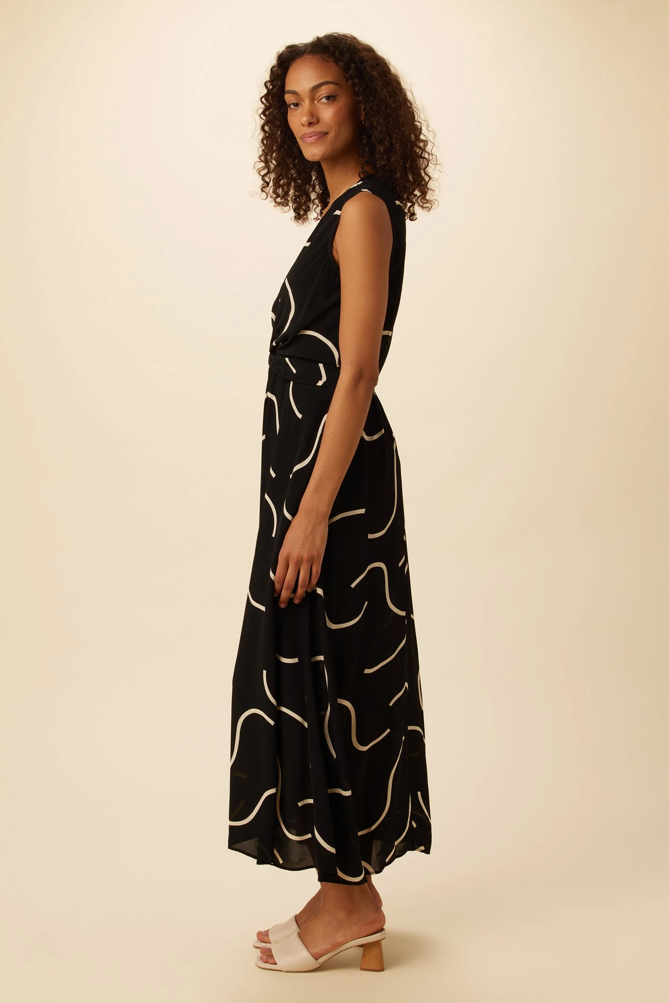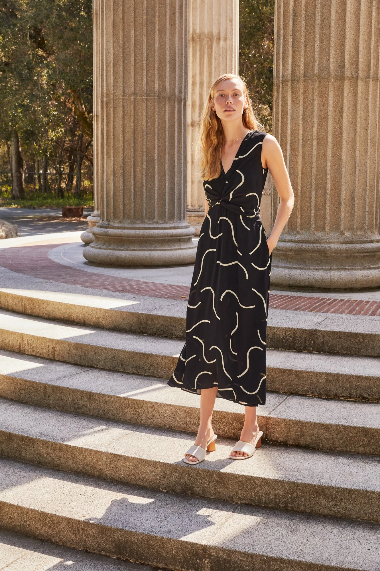 V-neck midi dress featuring side pockets and twist front detailing at the waist, comes with a slip lining. Made entirely from viscose, this easy silhouette is as comfortable as it is flattering.