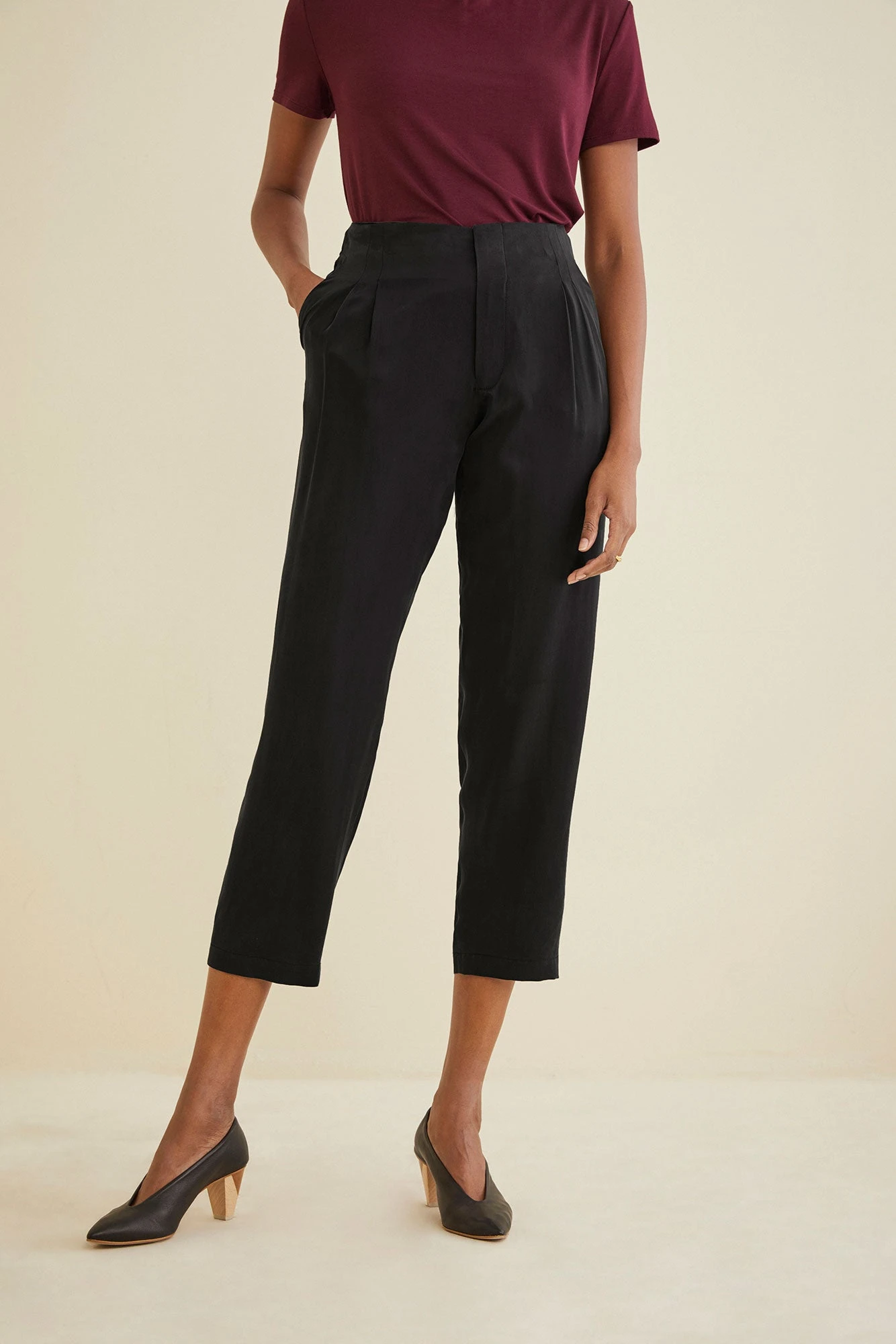 High waisted, straight-leg pants with a front zipper, internal button, and hook and eye closure. Made from our luxurious silk charmeuse, these pants are sure to elevate any outfit.