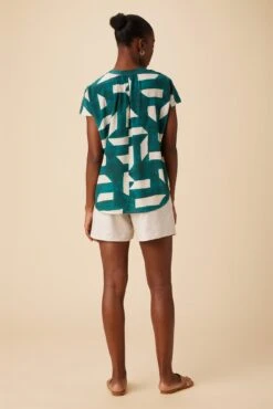 - Featuring a v-neck opening with single-button closure, short sleeves, and a relaxed fit.