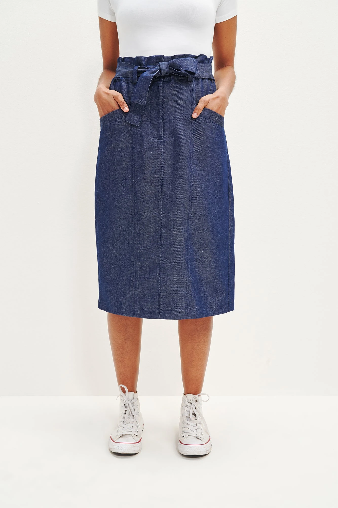 Super high paper bag waist midi skirt with front pockets, an adjustable waist tie, and back slit. Made sustainably from our soft and lightweight blend of Organic Cotton and Linen.