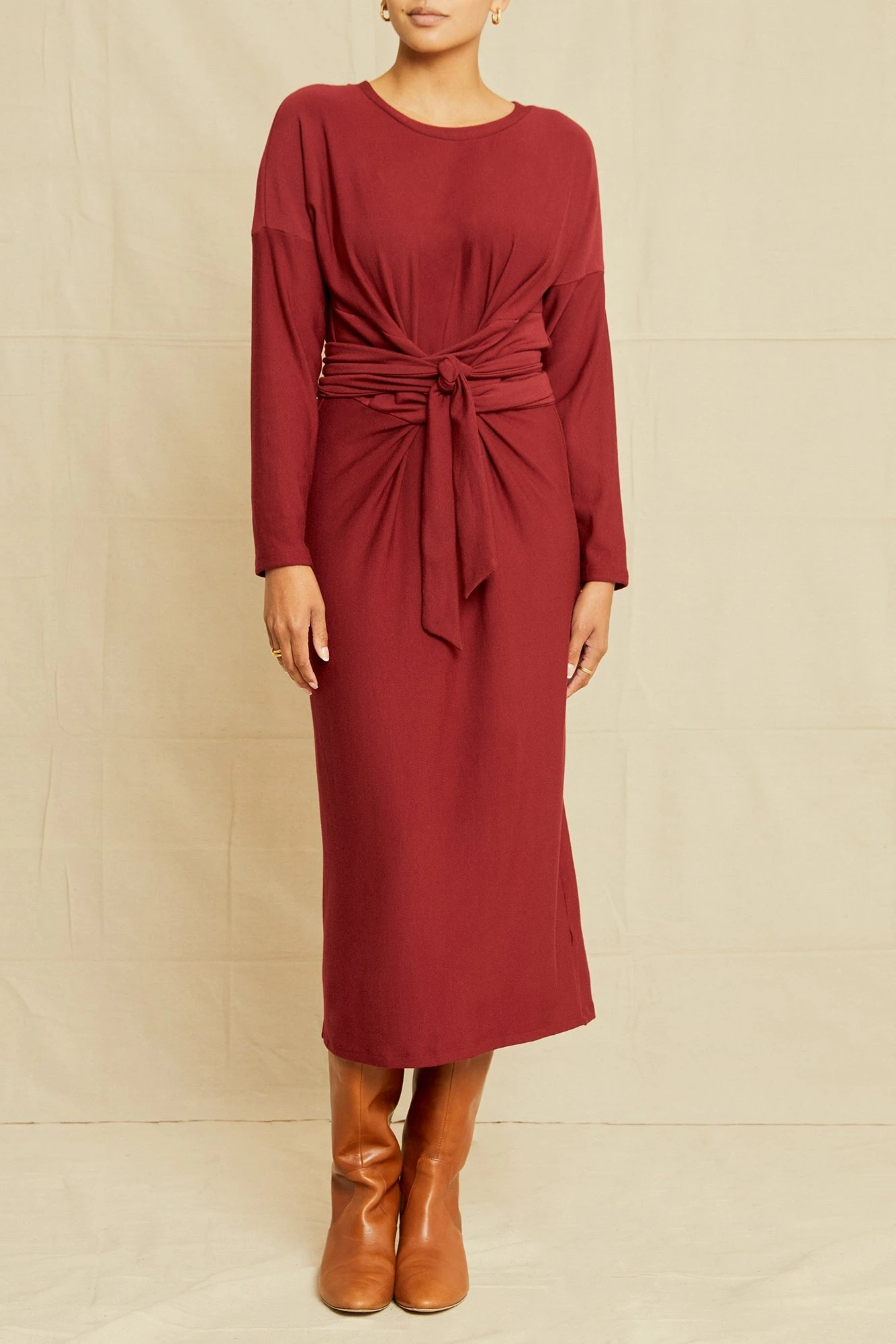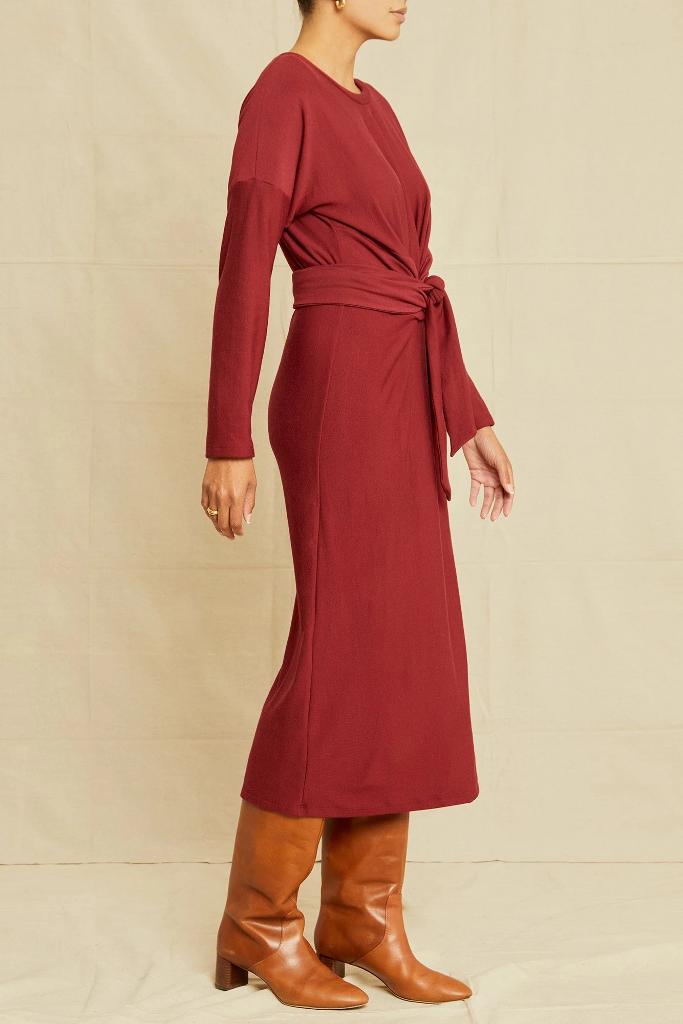 Long sleeve midi dress with an adjustable wrap tie and easy, straight silhouette. Made from our cozy fleece fabrics, this dress is as comfortable as it is flattering.